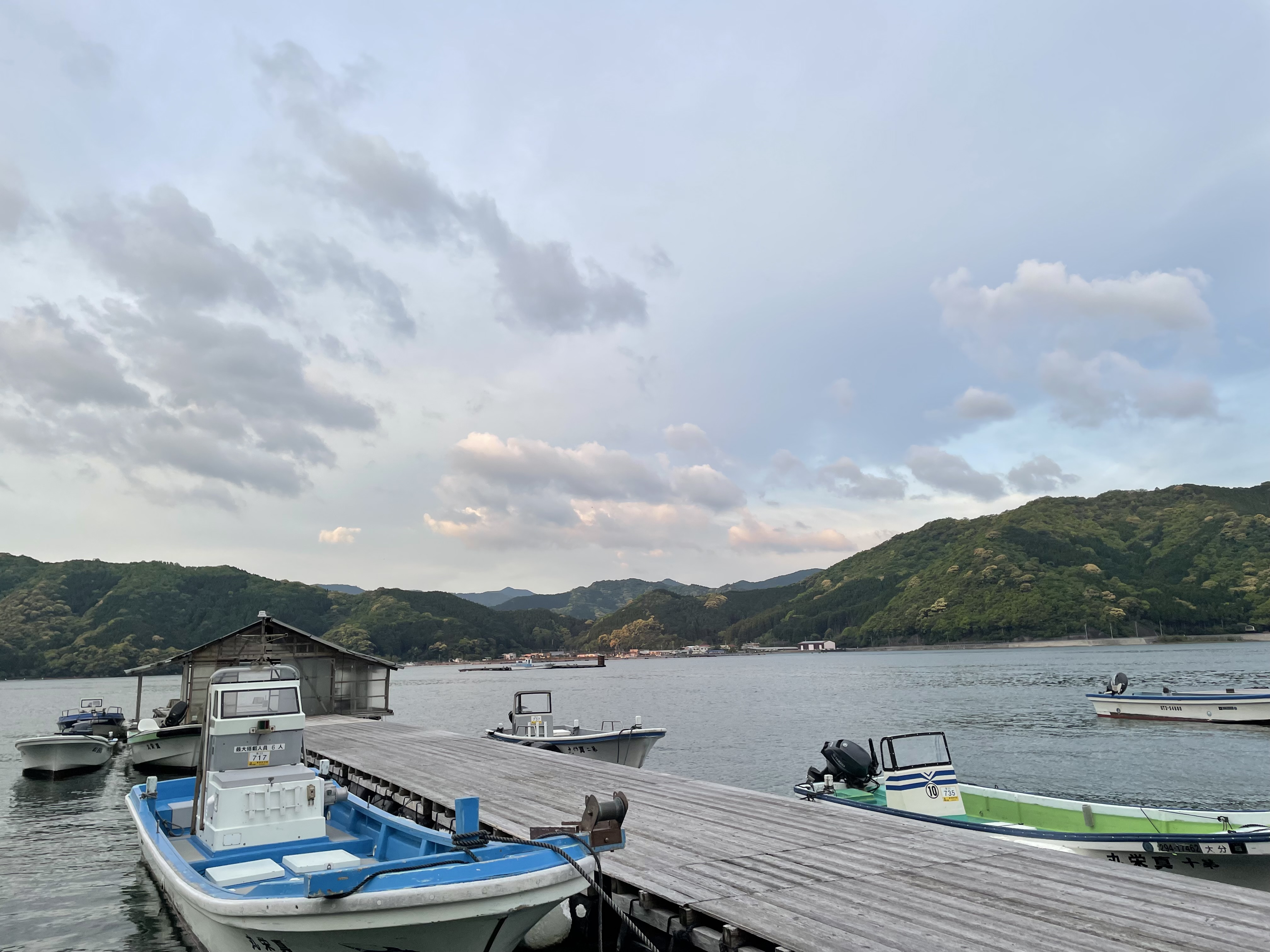 今朝の湾内は曇り、凪です