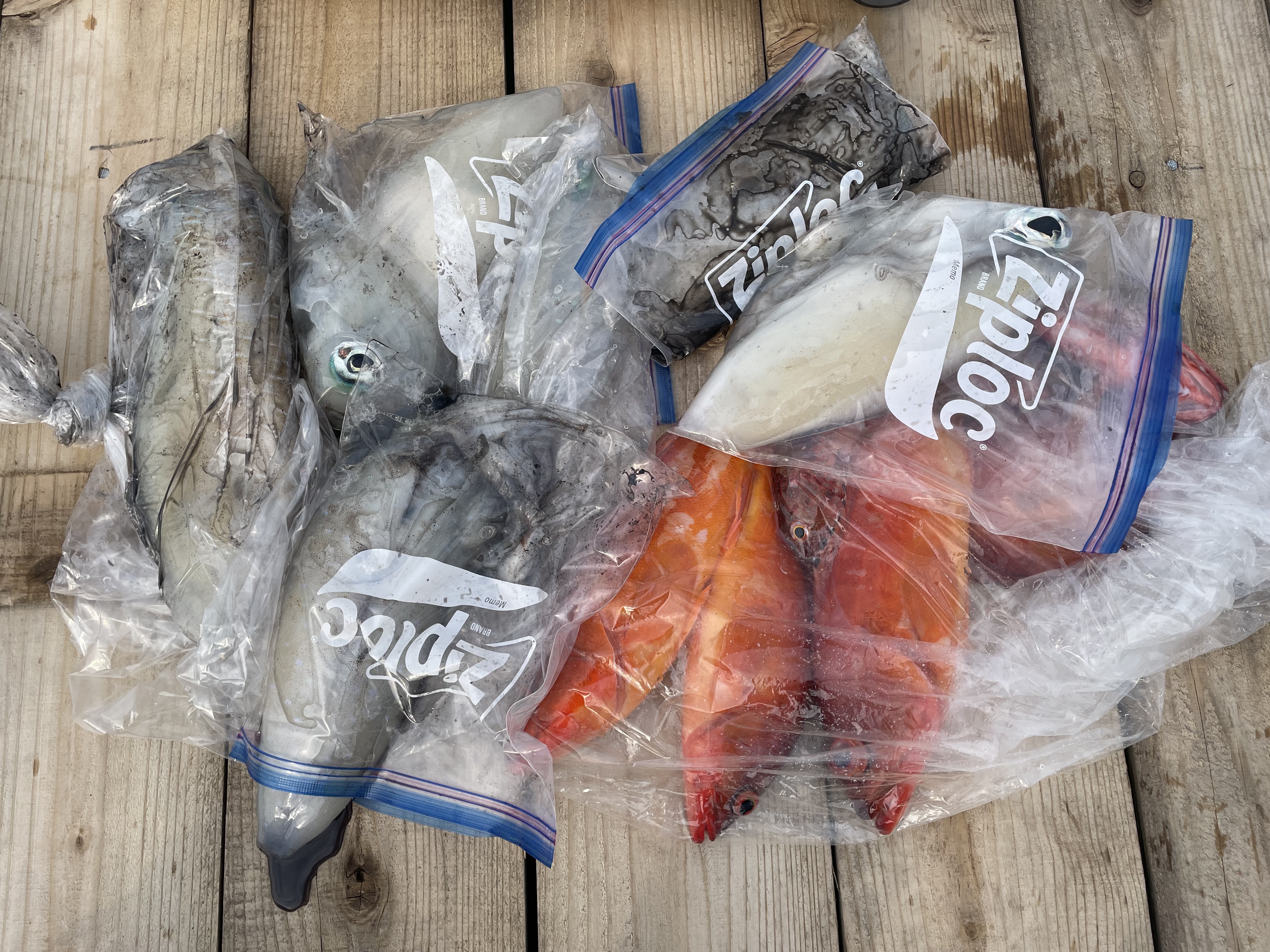 良型のアカハタ、カサゴにオオニベなど揚がっています
