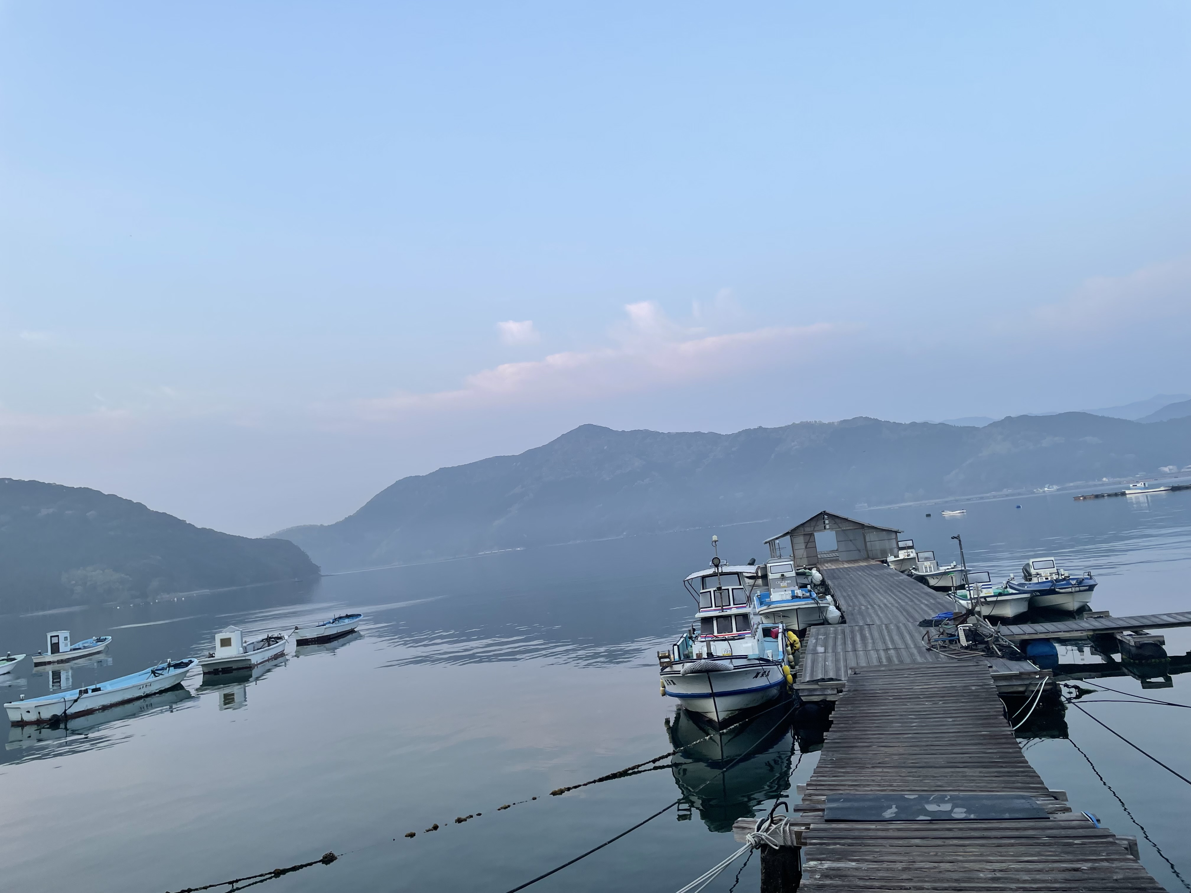 今朝の湾内は凪、少し霧が出ています