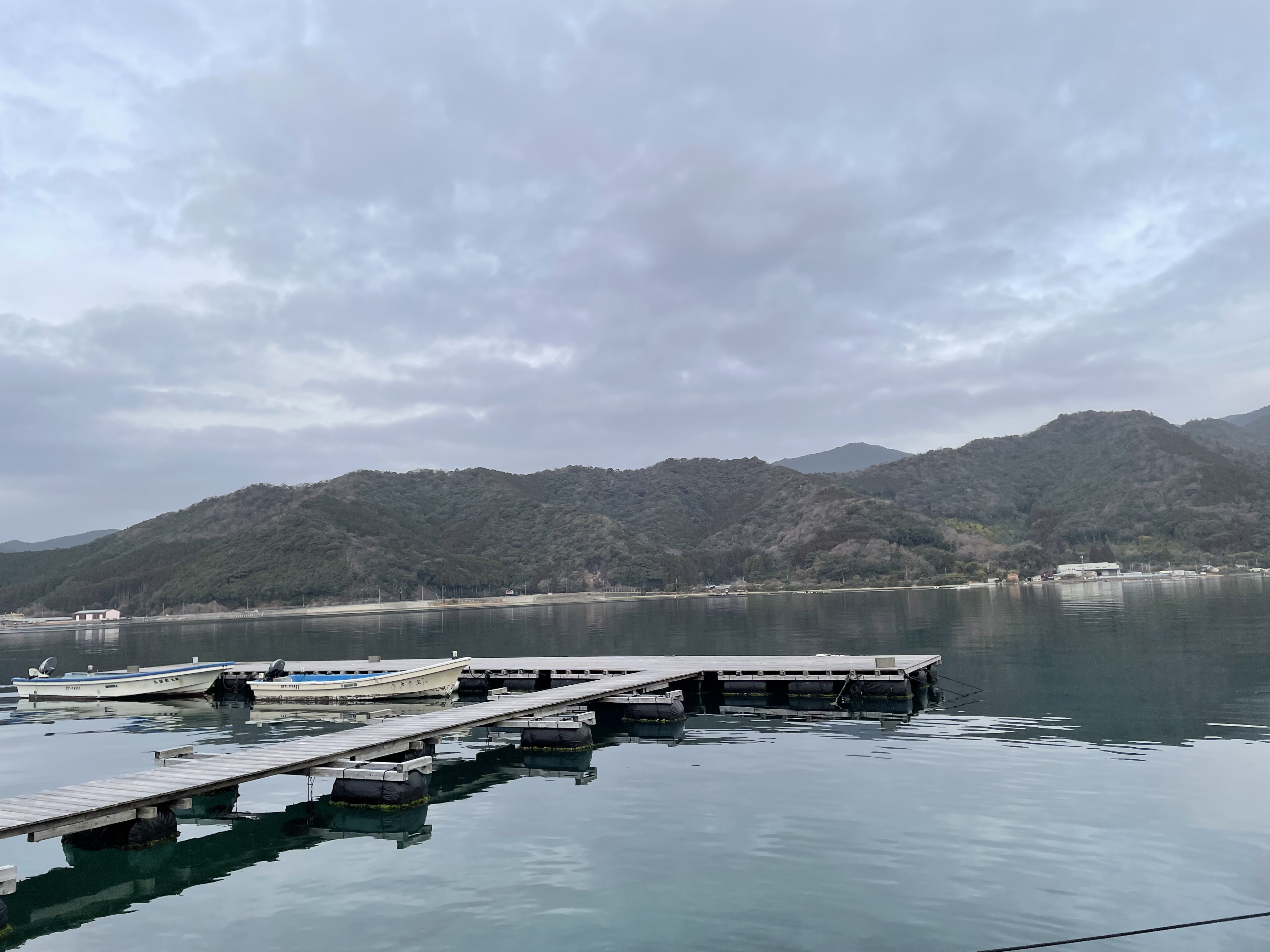 今朝の湾内は曇り、凪です