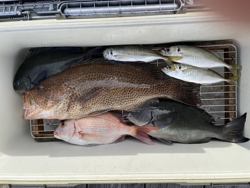 良型のオオモンハタにマダイ、クロ、小アジなど揚がっています