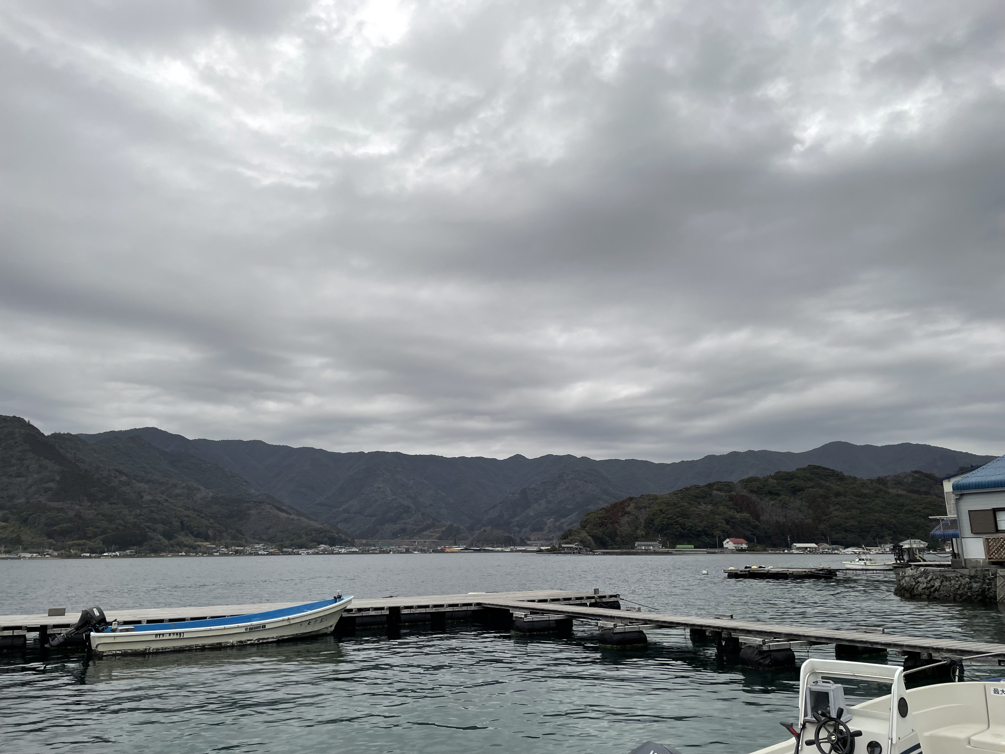 今朝の湾内は曇り、少し北風が入っています